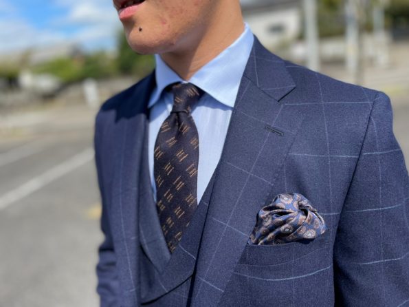 Vゾーンはネイビー系で統一。ネクタイはスーツの生地感に合わせて、ウール×カシミアのタイをチョイスしてます。