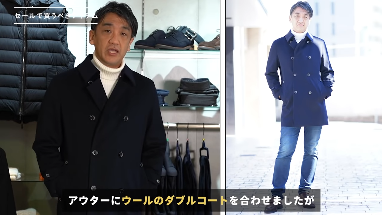 アウターにウールのダブルコートを合わせてみたんですけど、こんな感じもかっこいいと思います。首元が隠れてるということで3首、手首・足首・首を隠すとエレガントに見えるということですね。逆に出すと色気が出るということなんですけど隠すことでかなりエレガントに見えるので、こういう綺麗めのウールのアウターコートも相性がすごく良いと思います。