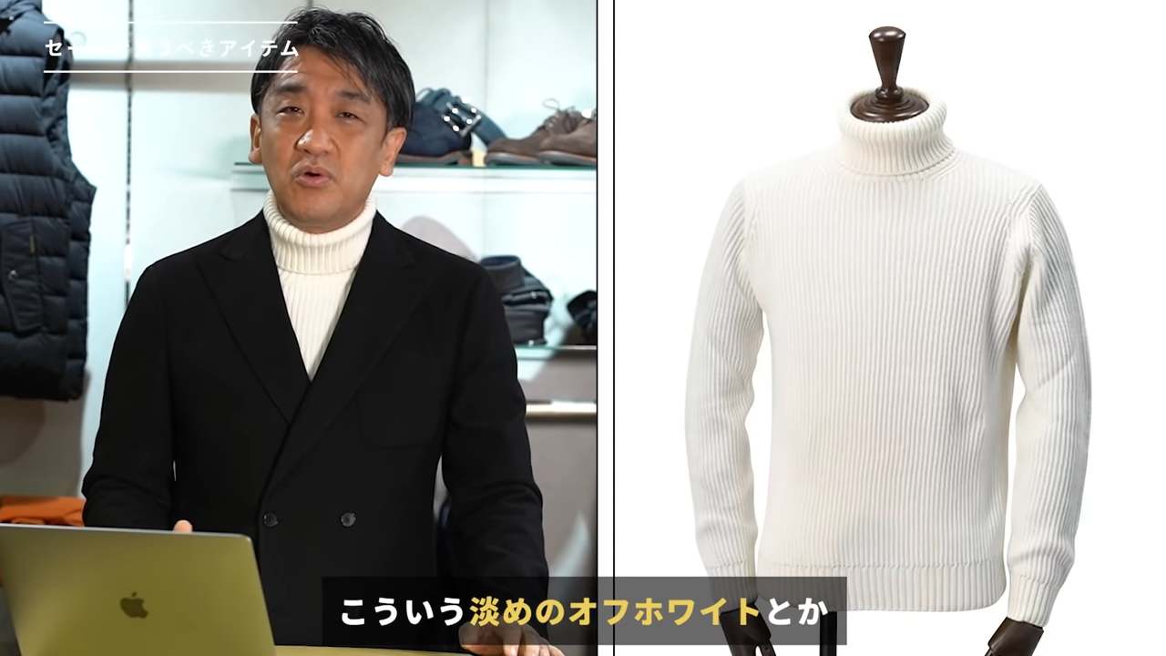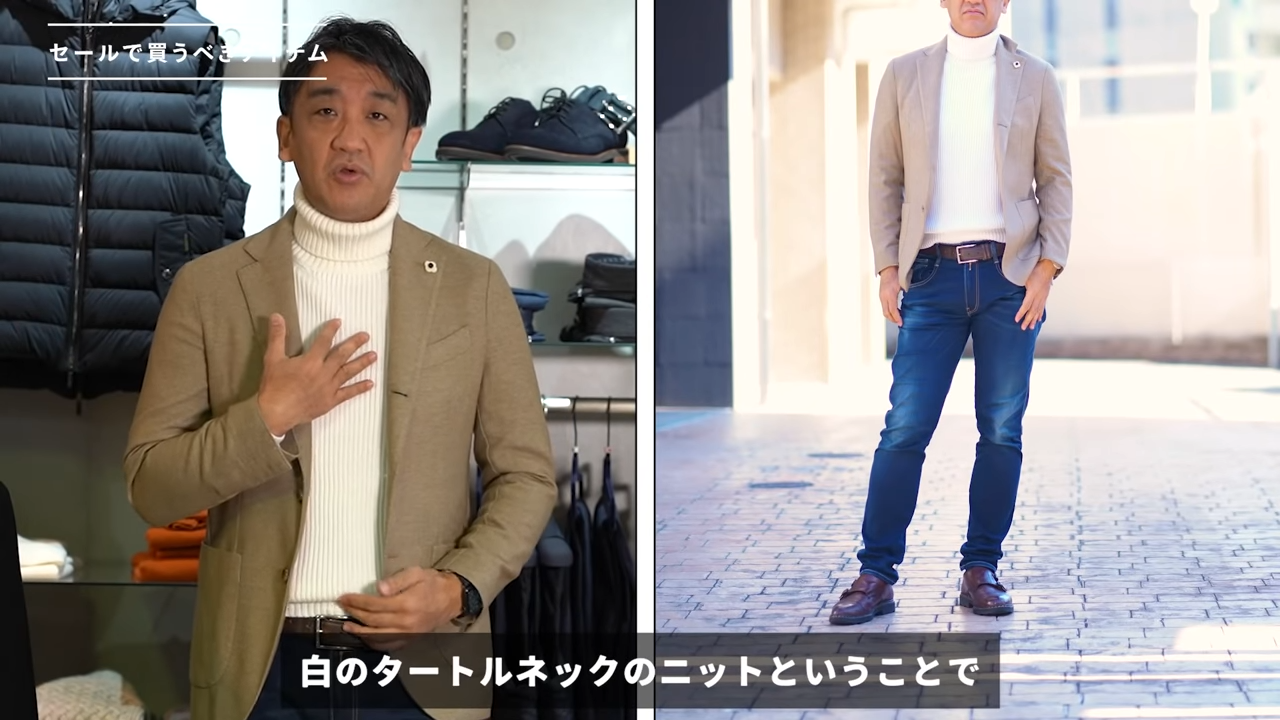 大人の男性でベージュを使うとちょっと黒に比べて顔が明るくなるので、明るくて優しいイメージを作ってくれると思っています。それのベースアイテムが白のタートルネックっていうことですね。
