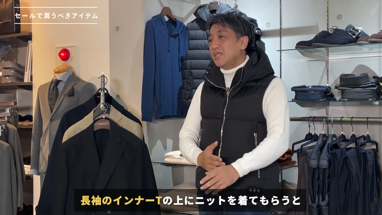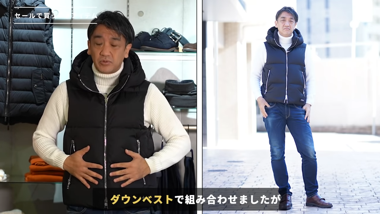 こんな感じですね。今度は逆にカジュアルに見せてダウンベストで組み合わせをしているんですけれども、こういうミドルゲージのニットだったらアウターをそのまま羽織っていただいても凄くかっこいいと思うので、是非こういうダウンベストは特に車に乗る方とかは使い勝手もいいので僕はオススメしたいと思っています。