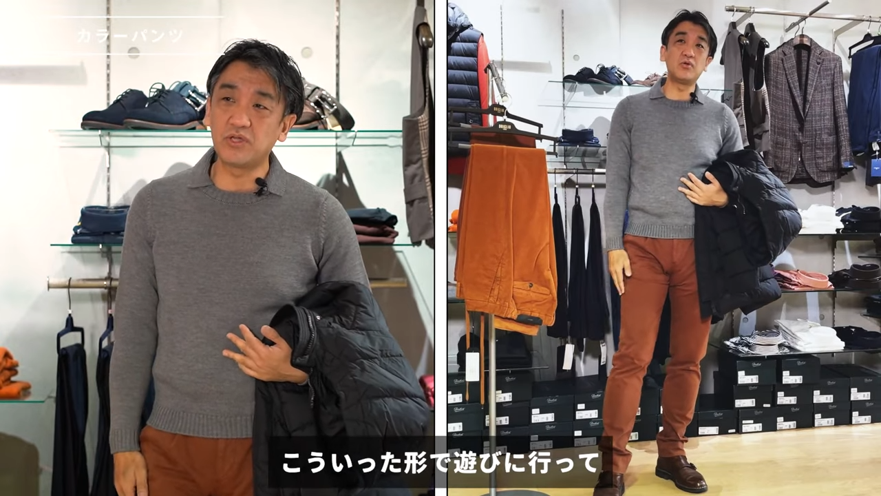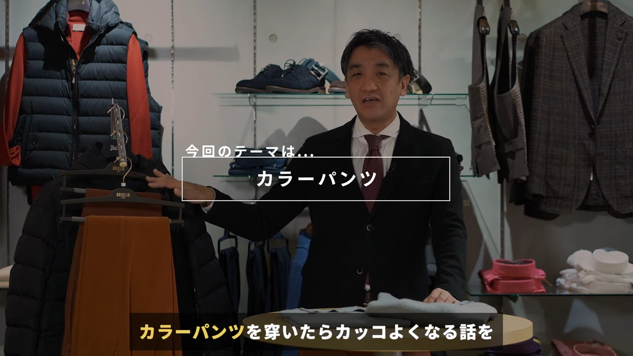 「まず似合わない」とか「自分の持ってるアイテムとコーディネートが合わない」とか「自分はオシャレじゃないと決めつけてる」とかそういう理由があると思うんですけれど、逆に言えばカラーパンツを穿けばそれだけですごくお洒落に見えると思うので、それをね実践していただくためにポイントのアドバイスをさせていただこうかなっていう風に思っています。