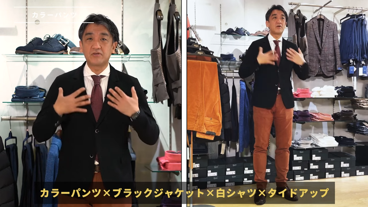 こんな感じでカラーパンツ×ブラックジャケット×白シャツ×タイドアップ。これ普段僕がお店で接客しているスタイルなんですけど、カラーパンツを他の色を合わせると結構ガチャガチャしちゃうんですよね。どっちかが目立って綺麗になた方がいいのでカラーパンツと合わせるならトップスはなるべく無彩色というか黒とかモノトーンですね。グレーとか白とかその辺の組み合わせでコーディネートしていただくとすごく映えますね。