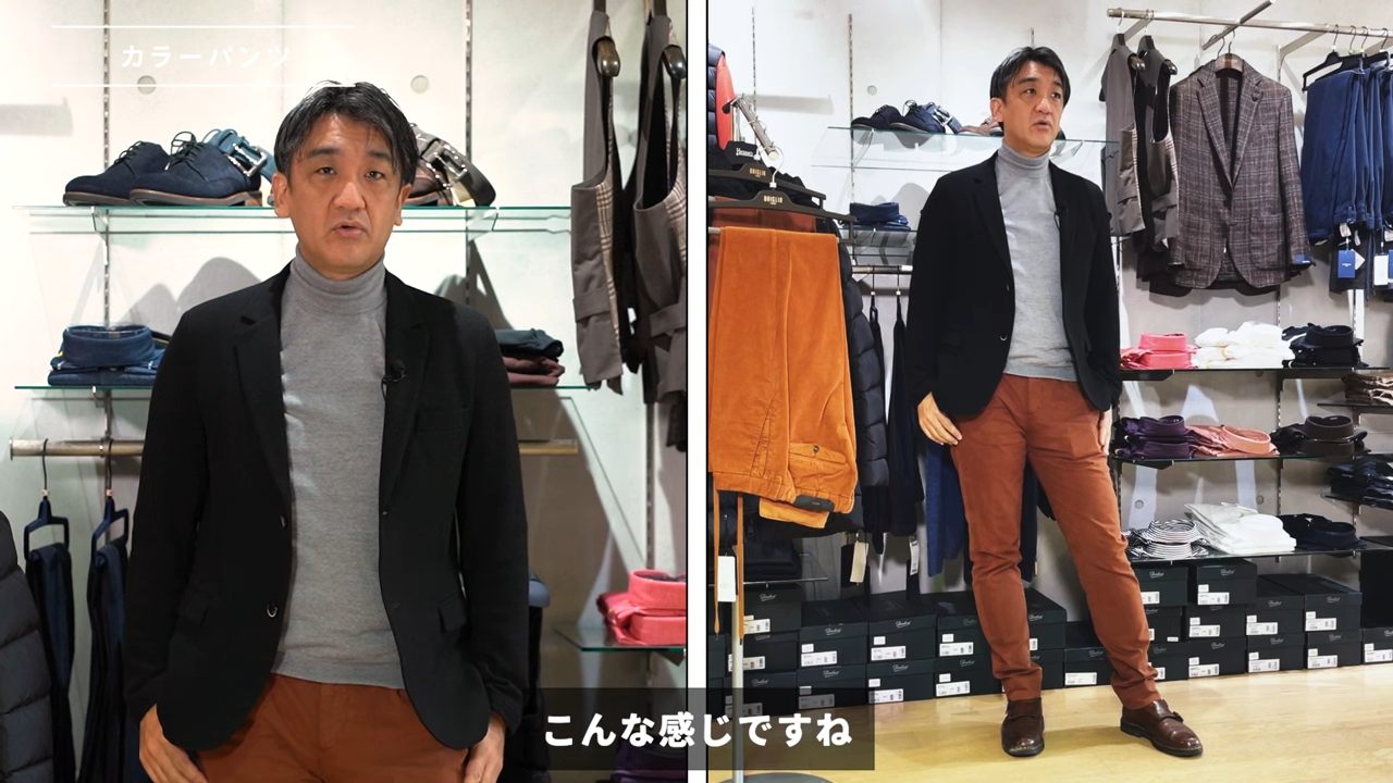 黒のコート、グレーのニット、白のシャツとかはお持ちだと思うので、そういうものと大人なくすんだ色目のカラーパンツを合わせていただくとそれだけでお洒落に見えるので、ぜひ挑戦してみたいと思う方は中々カラーパンツを選ぶ方は少ないと思うので、この機会に何か新しいもの買いたいなって思う……もしくは2022年になるんで「何か挑戦しようかな」って思う方はカラーパンツを挑戦してみるのもファッションの幅が広がってコーディネートも楽しくなるのでぜひオススメしたいと思います。
