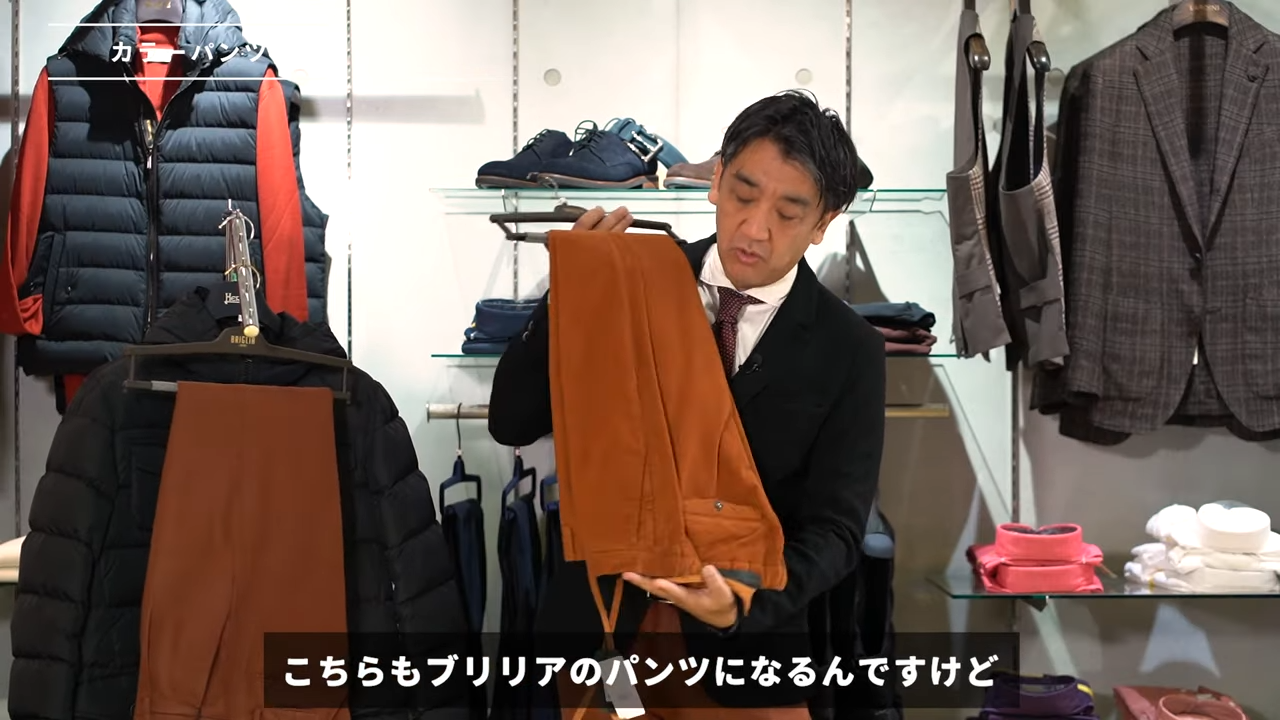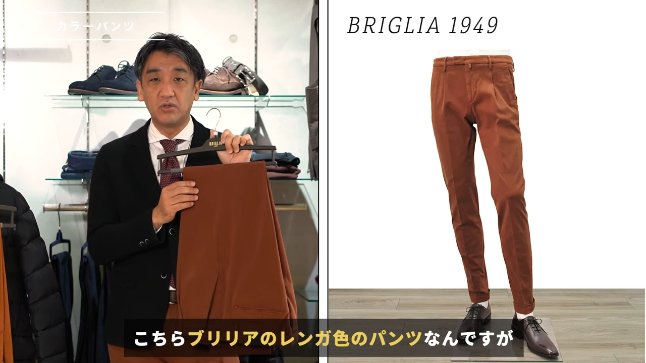 もう一点カラーパンツといってもアラフォー、アラフィフの方が穿くのはこちらブリリアのレンガ色のパンツなんですけれども、ちょっとトーンが落ちてて洗いのかかったような、もしくはねフェードがかかったようなちょっと派手じゃない落ち着いた色味なので、僕はこういう落ち着いた感じ……はっきりとビビットなカラーじゃないものをオススメします。