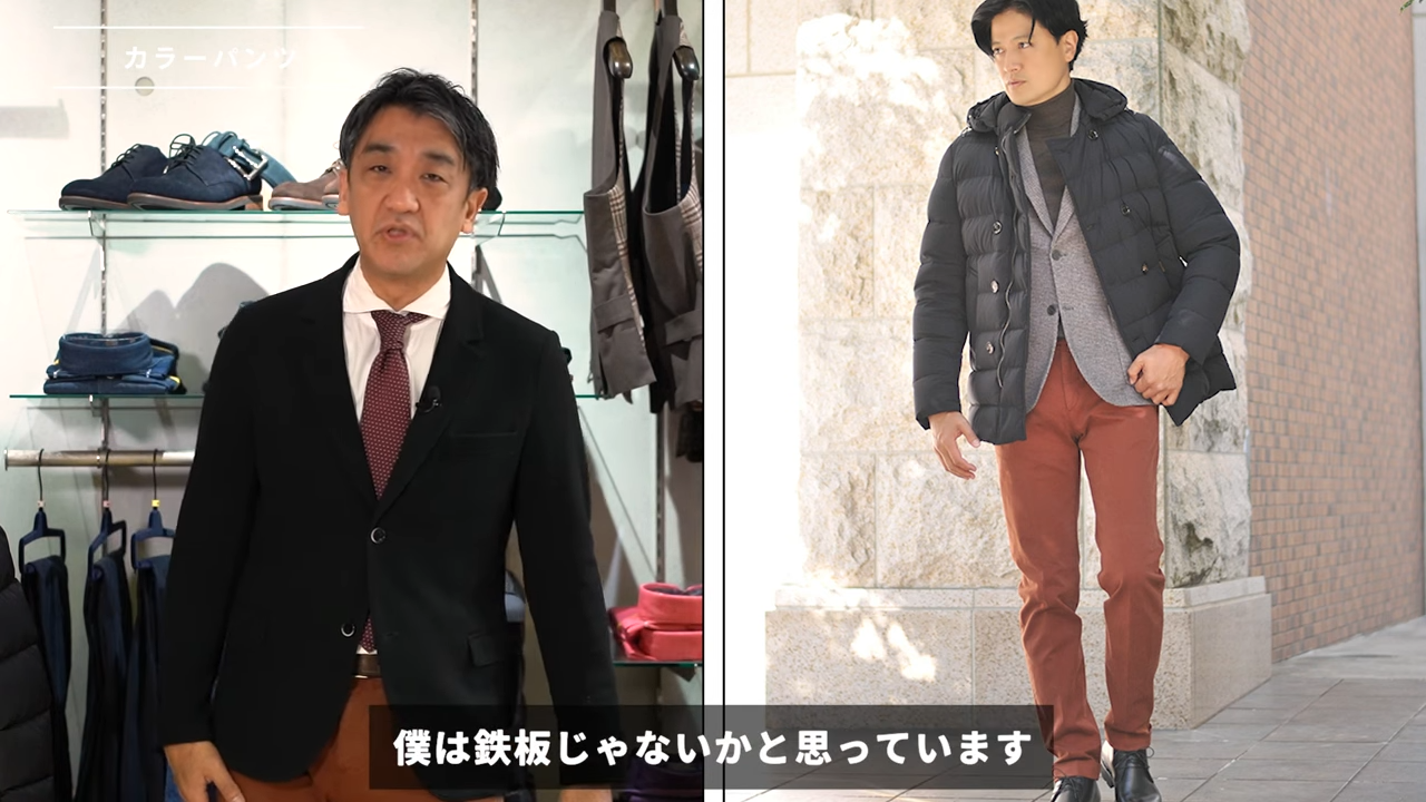 特に冬場だったらカラーパンツに黒いジャケットとか黒いアウターとかが僕が鉄板じゃないかなと思っています。