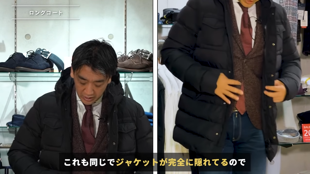 気にしない方も正直お見えになりますが、どうせならジャケットが隠れた方がスマートだと思うので、長めのコートがいいんじゃないかなと思っています。