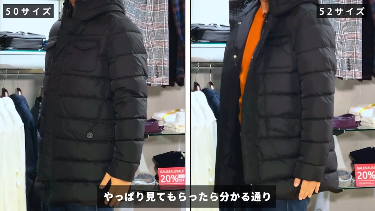 一つダウンコートを選ぶときに注意して欲しい事がありまして、それは何かっていうと大きいサイズを選びすぎないことですね。これがすごく僕は大事なことじゃないかなと思います。