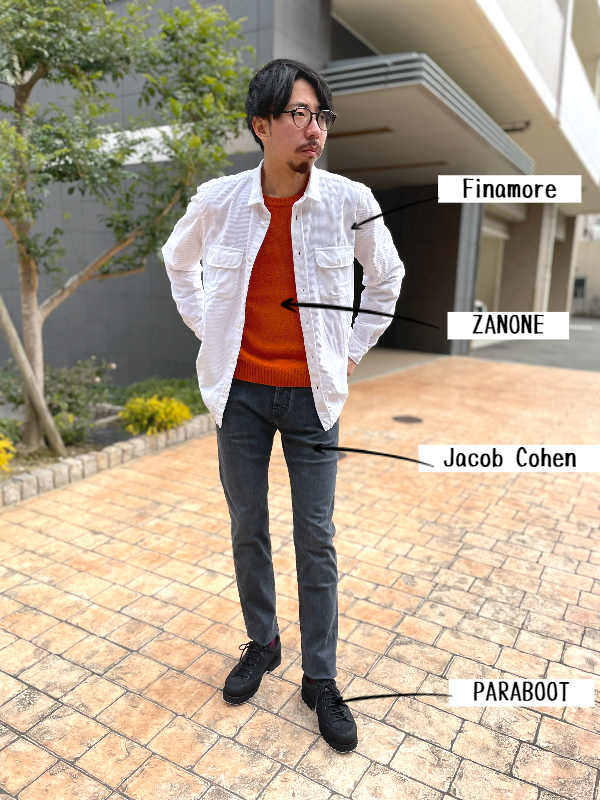 フィナモレのシャツは彩度が強く、割と真っ白に近いので春にも重宝する1着になってくれると思います。