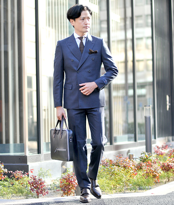 お堅い印象のダブルブレストスーツを、美しいフォルムを兼ね備えてこそ、品格が演出できます。