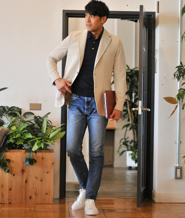 上品さを保ちつつ、イージーデニムでカジュアルダウンさせた着こなしです。