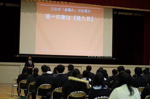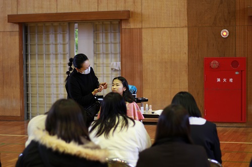 後半には、男子生徒はネクタイの結び方を実演形式でレクチャーし、女子生徒にはプロのメイクアップアーティスト、千代香さんからメイクアップの方法についてレクチャーして頂きました!