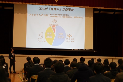 前半は身嗜みの必要性をお伝えした後、高校生ということでスーツを持っていない方が殆どですのでスーツを着用する際に必要になってくるアイテムのご紹介。また、スーツの着こなしのNG集という事でスーツのルールについてお話をしました!