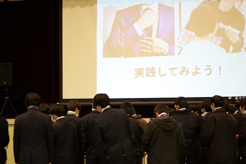 ネクタイの結び方の実演が終わってからはスケジュールの都合で男子生徒のみ冠婚葬祭のお話に移りました!