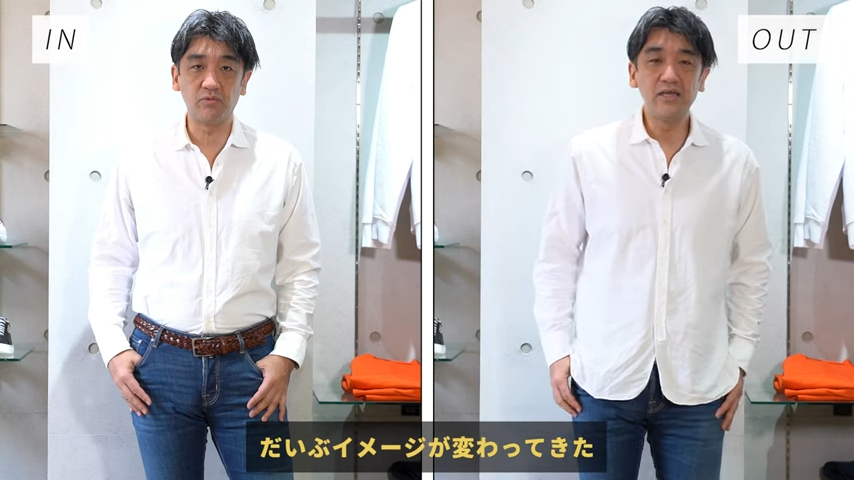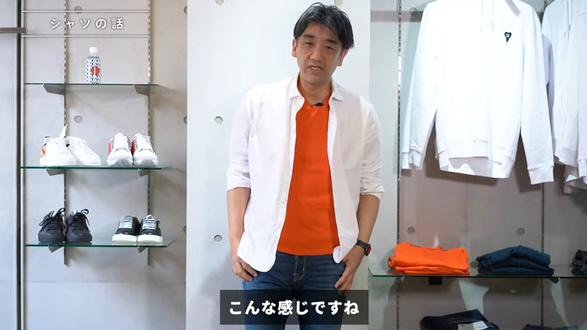 この辺の絶妙な丈のシャツを買っていただくと何がいいかっていうとインでもできるしアウトもできる、すごい幅広く使うことができるんですよね。
