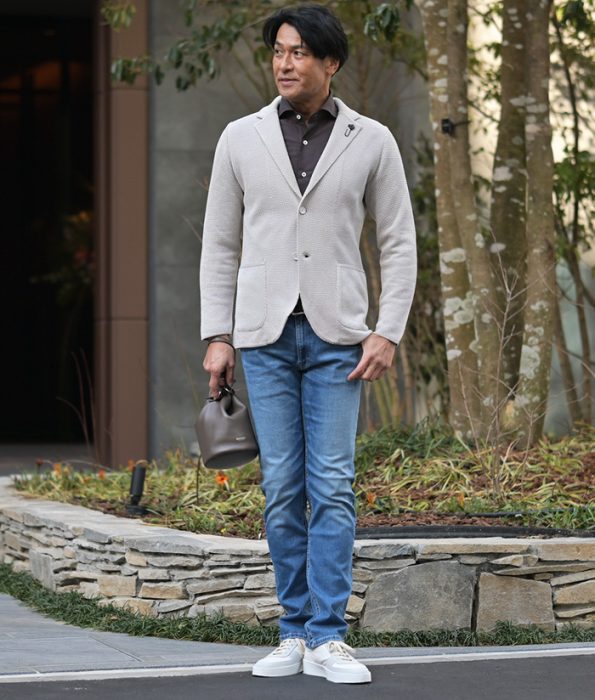 ライトグレーのニットジャケットを合わせた上品で柔らかい印象のコーディネート。ニットジャケット特有のストレッチ性と軽さがあることで、かっちりしすぎずリラックスした着心地を実現しながらも、見た目はしっかりと大人らしく整えてくれます。