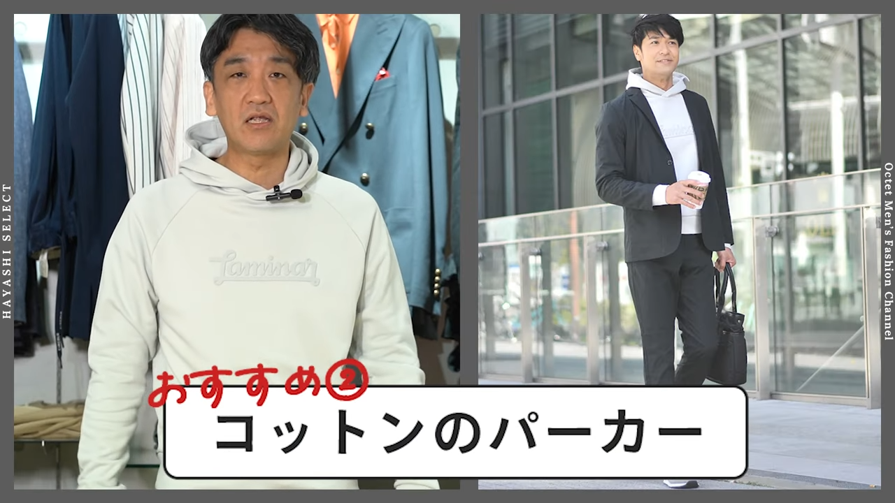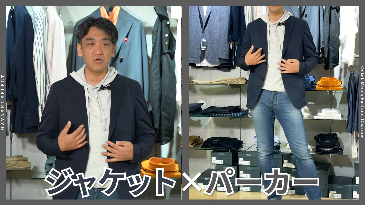 ちょっとこうアメカジっぽい感じもしますけれども、ニットパーカーだったらこの組み合わせも僕はいけるんじゃないかなという風に思ってます。こんな感じですね。(パーカーにジャケットスタイルは)あんまり得意じゃないですし、好きじゃないんですけれども、LEONの雑誌とかだと高級車が隣にあって綺麗なお姉さんがいてそういう車に乗り込むような感じで、こういうジャケットとかね。あとレストランに行く風景とかね。で、ちょっとカジュアルダウンしてるんだけどエレガントに見せるみたいなところで、こういうスタイリングを使っていることが非常に多いので。