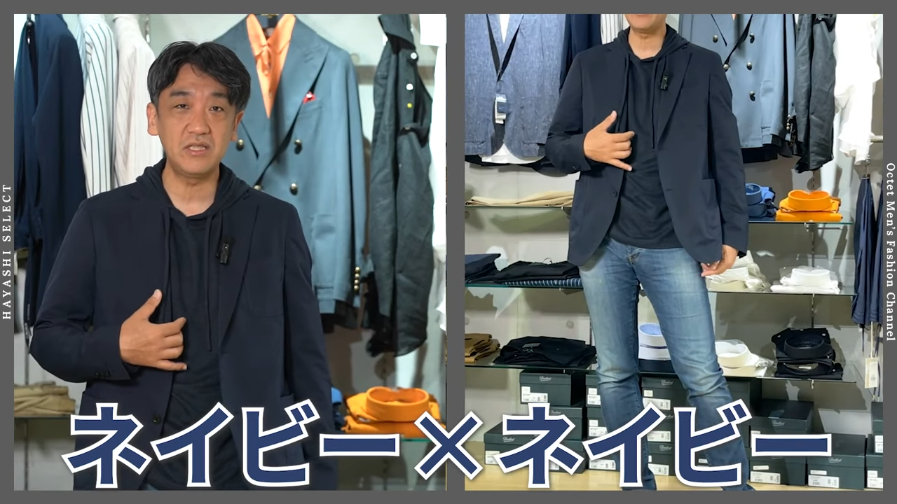 こんな感じですね。ネイビーにネイビーのジャケット。トータルでもブルー系のコーディネートにまとめてみましたけど、実際にネイビーのパーカーでも大人っぽい着こなししていただけるんじゃないかなと思います。着ているパーカーはマジェスティックのパーカーなんですけれども、生地が薄くて夏も着ていただけるんじゃないかなって思ってます。