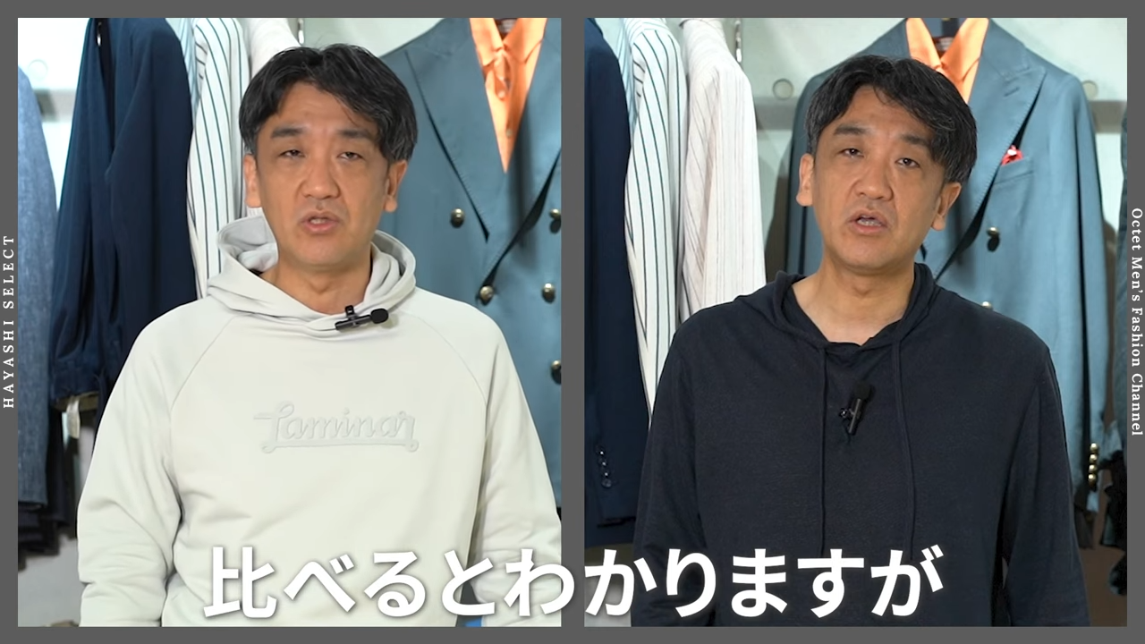 厚手のコットンのパーカーを選んでしまうとカジュアル感が強くなってしまうので、ちょっとツルッとした……こちらはラミナーっていうロゴがあるんですけど、ヘルノラミナーというブランドなんですが、ロゴがあんまり目立たないものがいいです。全く無地だと、これもまたコットンで無地というのはいろんなブランドがたくさん出してますけれども、それまたちょっと難しいなって思うこともあるので、ブランドロゴが書いてあってもいいんですけれども、なるべく大人しい感じで書いてあるものがいいんじゃないかなっていう風に思います。