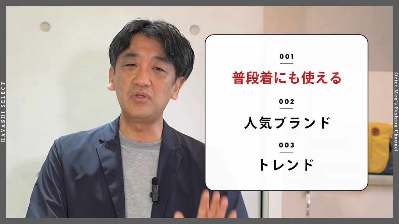 改めまして、オクテットメンズファッションチャンネルの林です!僕のチャンネルは、自分の気に入ったアイテムやブランド、コーディネートのアドバイスをするチャンネルとなっております!