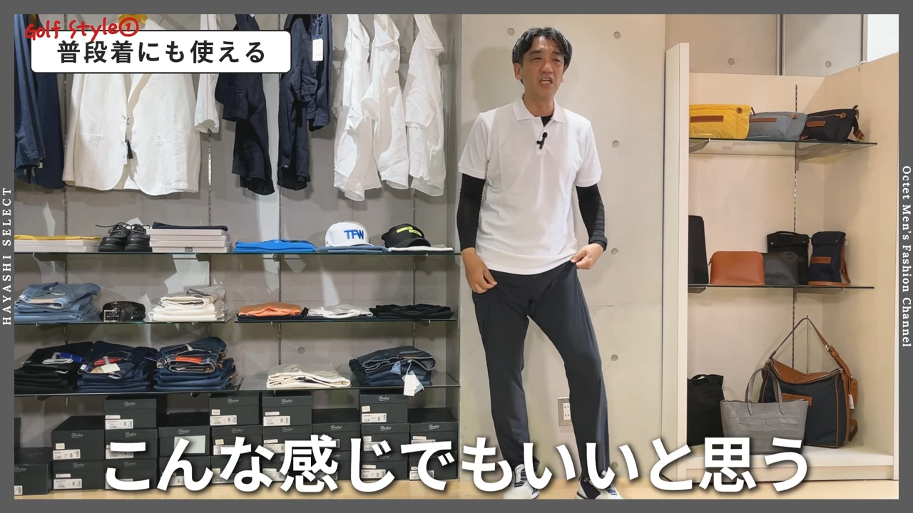 パンツも結構細いんですけれども、ちょっと丈が短めで足首が見えるぐらいの感じが割とトレンドで、そういうアイテムが多いんです。これは好き嫌いが非常に分かれるんですけど、僕はあまり好きじゃないんですけれど。(笑)足首が見える感じ、こんな感じのデザインが今はトレンドですので、ゴルフだけじゃないかもしれないですけど、ジムワークなどにも使えるので、そういう運動するというくくりでこういうアイテムを1点買っていただいて使っていただくというのはいいんじゃないかなっていう風に思っています。