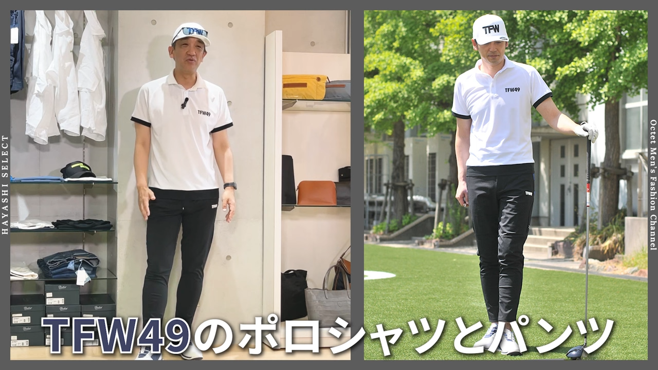 こんな感じですね。TFW49というブランドのポロシャツとパンツの組み合わせになるんですけども、TFW49というのはJUN HASHIMOTOがデザインして監修しているブランドになるんですけども、最近人気になっていて今シーズン、オクテットでも取り扱いをしているんですけども、結構評判がいいのでこんな感じで着てみたらどうですかというご紹介になります。