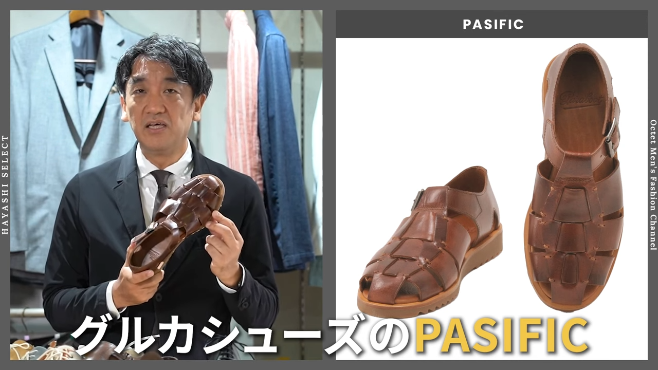 もう一つ、やっぱり夏に履きたいよというと、デッキシューズもあるんですけれども、今の時代だったらグルカシューズのPASIFIC(パシフィック)ですね。こちらグルカといって編み込まれたレザーで作られたサンダルになるんですが、やっぱり履き心地はヒールもあることで非常にいいです。そして、デザインもちょっとドレッシーなので、ジャケスラにもギリギリいけるかなっていうぐらいのフォルムになってるというのもあって、今すごい人気になっています。