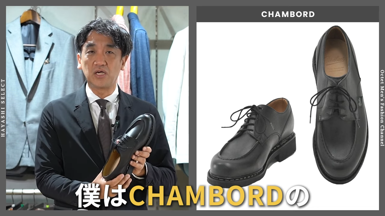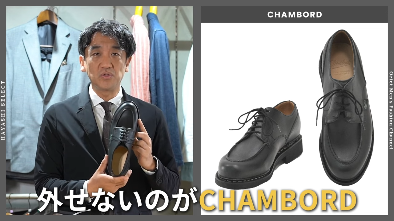 僕はこのCHAMBORD(シャンボード)のお話をよくさせてもらうんですけれども、こちらのフォルムだとオンオフどちらでも使えます。本当にいいドレスのテーラードのスーツに合うかといった時にはちょっと議論になるんですけれども、今の日本のビジネスにおいてはジャケット&スラックスだったり、スーツがちょっとカジュアル化していると思うんですね。なのでカジュアルっぽいエレガントなスタイルと、今度は逆に休日のちょっとエレガント寄りなスタイル。これには、このパラブーツのドレスシューズがちょうどぴったりじゃないかなと思うんです。