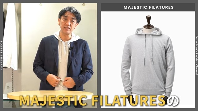 MAJESTIC FILATURESのニットパーカーになるんですけれども、これはやはりコットン違ってニット素材になると、それだけでちょっとエレガントだと思うんですよね。実際に自分がジャケットの下にパーカーを着るかと言われると、少し迷うことはあるかもしれません。やっぱり若い方とかはパーカーにジャケットを着ることで、カジュアルなアイテムがよりエレガントに見えるっていうのが僕はすごくあると思ってます。