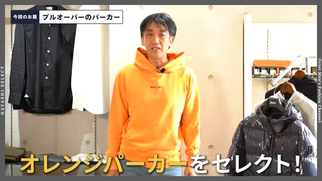 最後は色のある着こなしということで、オレンジのパーカーをセレクトしてみました。ここでおさらいですがパーカーの良さっていう中で、一つはリラックス感というのがあると思うんですよね。家の中でも、外でもパーカーっていうアイテムがリラックスして着ることが出来るアイテムなので、気持ちもカジュアルにリラックスできるっていうアイテムなのかなと思います。そういう意味ではこういった思いっきりカジュアルなアイテムというのも、パーカーのセレクトの中の一つに合わせていただけたらいいなと思っています。