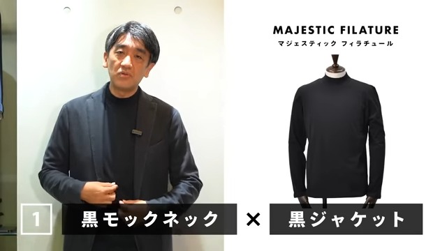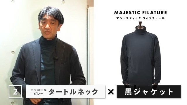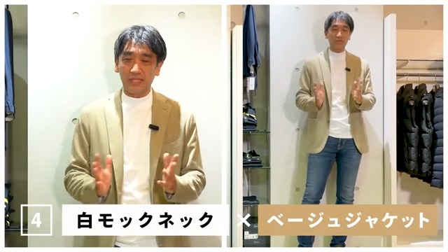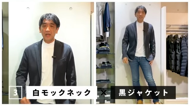 先程の黒のモックネックと白のモックネックを比べてもらったらわかるけど、だいぶ印象が変わると思うんですね。こういった部分で白と黒2枚持っていっていただくと同じアウター、同じジャケットでも印象が大きく変わりますので、こういった形でコーディネートの幅を広げてもらうっていうのも僕はすごく大事なことだと思います。