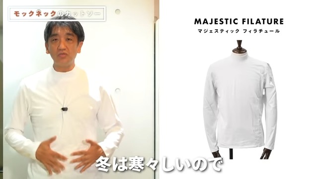 モックネックっていうと、ウール素材のアイテムっていうのが非常に一般的じゃないかな。ウール素材のアイテムも冬はやっぱり見た目も暖かいですし、必須のアイテムだと思います。また1枚持っていれば、それは来年も再来年も使えるアイテムではないかと思うので是非持って欲しいんですが、それとは別に今回はマジェスティックというブランドのモックネックをコーディネートしながらご紹介できたらいいなって思っています。