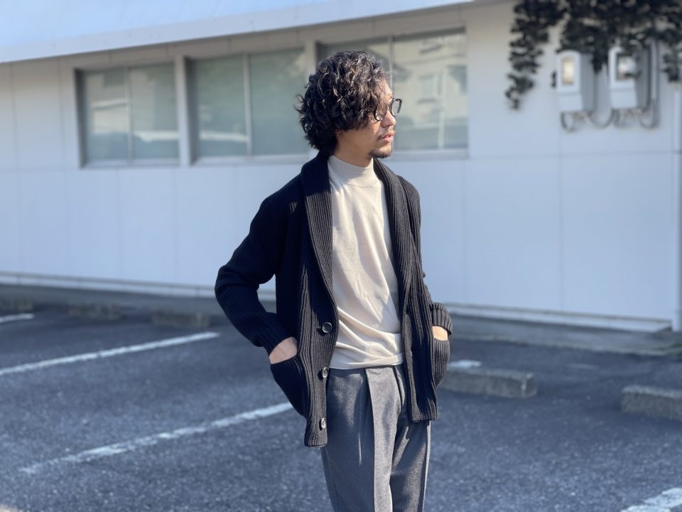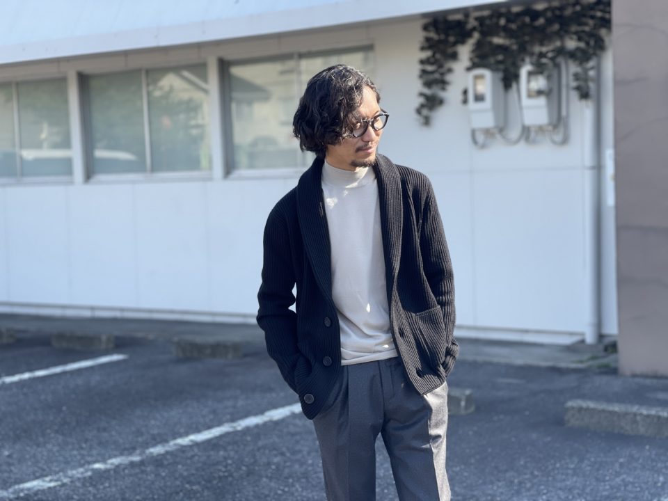 今作は、ショールカラーのウールカーディガンで秋口から本格的に幅広く使えるアイテムです。丸みのある襟と、ニットのふんわりとした生地感はかわいらしさがありますね。しかし、上品さも欠けておらずドレス感とカジュアル感の両方を持ち合わせたアイテムとなっております。