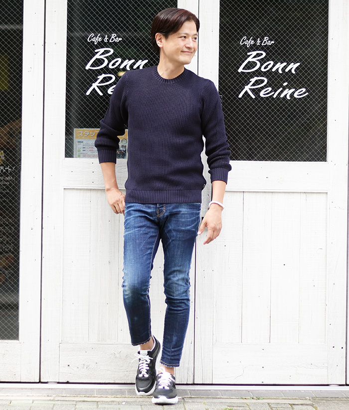 トップスもシンプルなネイビーのニットで、とことん無駄をそぎ落とす。