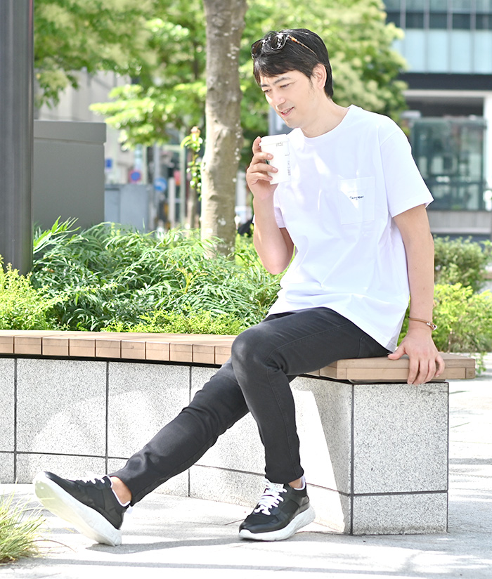 シンプルに白Tとブラックデニム。もちろんこのままでも十分良いんですが、ここでちょっとボリューミーなスニーカーを合わせる。