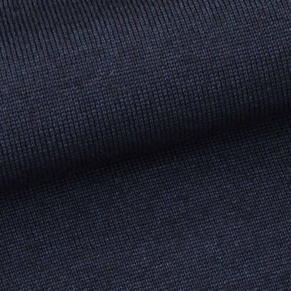 素材はウール100%となっています。天竺編で編み立てられており、生地にコシがあり型崩れはしにくくなっておりますが、触り心地は非常に柔らかでさらっとした肌触りになっております。また、ハイゲージのキレイな印象を損なわない首元や袖口、裾にすっきりとしたリブが施されております。