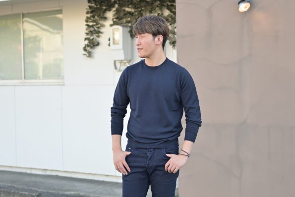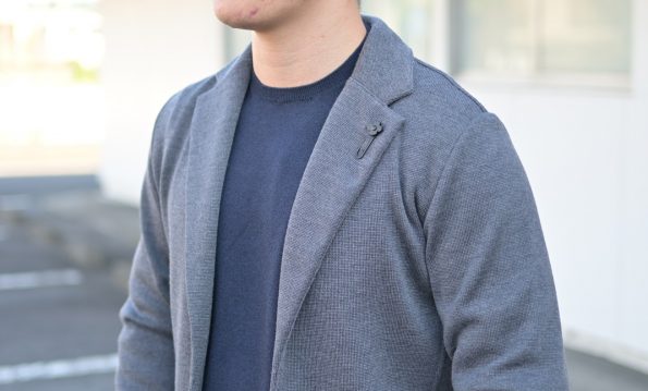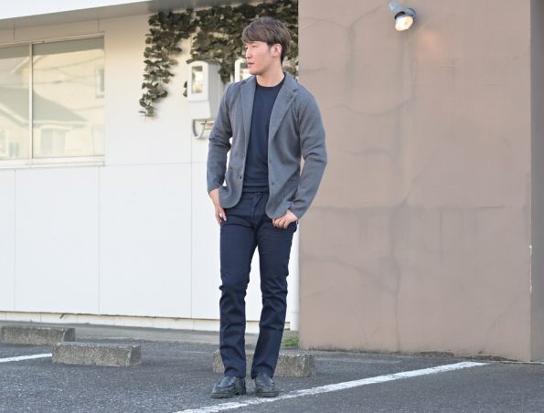 今回ご紹介のニットを使って全身のコーディネートをしました。ニット、パンツはネイビー系で統一し、ネイビーと非常に相性の良いグレーのジャケットを合わせた着こなし。デニムとニットジャケットを合わせておりますので、肩肘張り過ぎずキレイ目な着こなしとなっております。