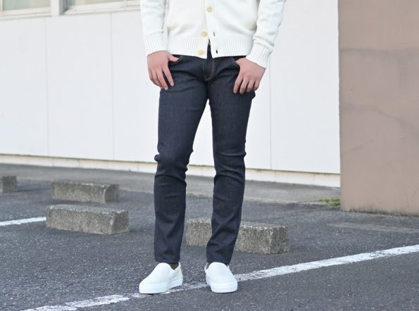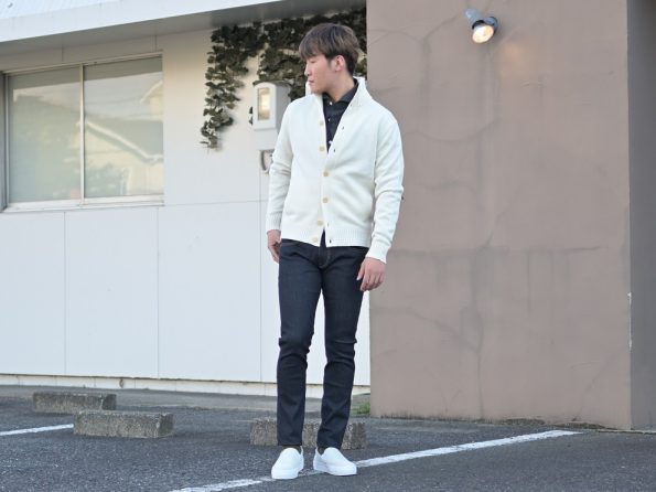 最後に今回ご紹介しているデニムを使ってコーディネートを組んでみました!デニムに、ザノーネのニットカーディガンを合わせました。また、シャツは、デニムの近い色味をチョイス。暗めのデニム、シャツ以外のカーディガン、シューズはアイボリーを合わせて季節感のある明るい印象にしました。今回デニムは、ジャケットとも合うと思いますので非常に使い勝手が良かったです。