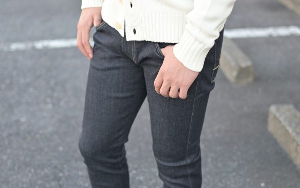 全体的にリジッド感のあるクリーンな印象。ダメージやあたりがないタイプなので経年変化により自分だけの一本に育てる事も出来ますね。奥行のあるインディゴブルーは、シンプルながら上品さも感じさせ、大人カジュアルのスタイリングにはピッタリのデニムではないでしょうか。