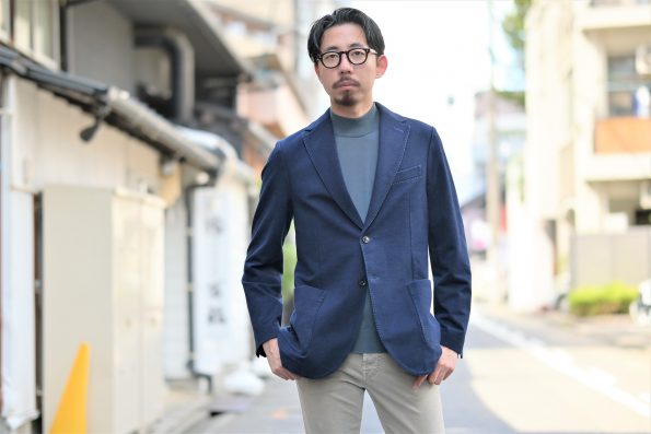 モックネックにチノパンを合わせてみましたが、シャツでもデニムでも幅広い組み合わせで活躍する万能なネイビージャケットですね。