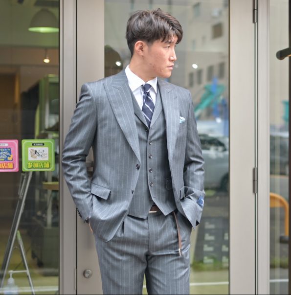 同じくゼニアの3Pで、ミドルグレーにストライプの一着。滅茶苦茶良い仕上がりで僕も感動しています。