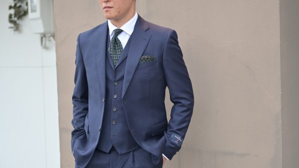 先ずはベーシックな大定番、ダークネイビーのスーツでございます。なんだかんだ、一番売れるのはこのネイビーのスーツです。
