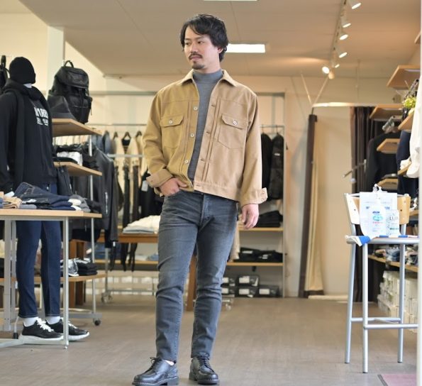 今回は、インディゴではなくブラックウィッシュのデニムを合わせてみました。インナーはカットソーではなくニットをチョイス。ブルゾンが持つ上品さをさらに引き立てる為他のアイテムはキレイ目なアイテムを合わせました。