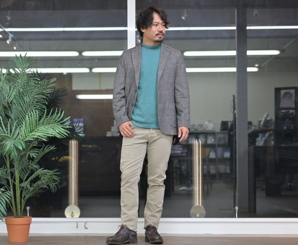 モックネックをジャケットと着用する時の着こなしに迷った際は、セットアップスタイルが非常に簡単でジャケット初心者でも愉しみやすいかと思います。