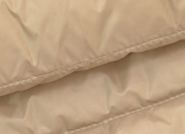 軽量を実現している生地は、高密度で仕立てた超軽量の撥水ナイロンになります。特徴としては、きめが細かくサラッとした肌触り且つソフトでふんわりした質感になります。