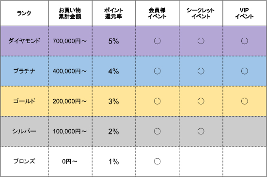 ・ランクが上がるごとに特別なイベントのご案内がございます(VIPイベントも内容に差がございます)