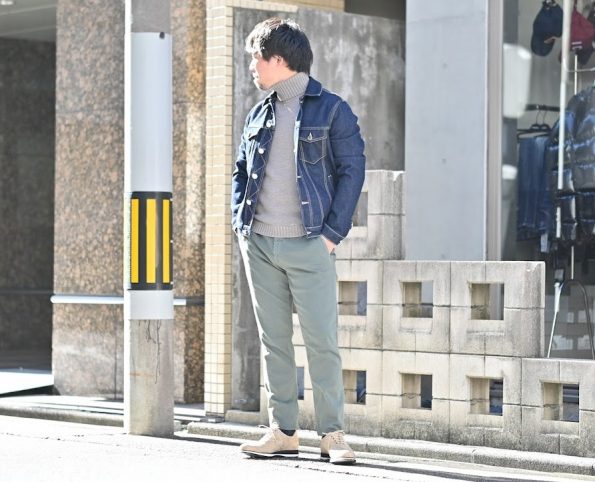 ミドルゲージのタートルネックを合わせました。パンツはカーキでミリタリーな雰囲気はジージャンと非常にマッチすると思います。