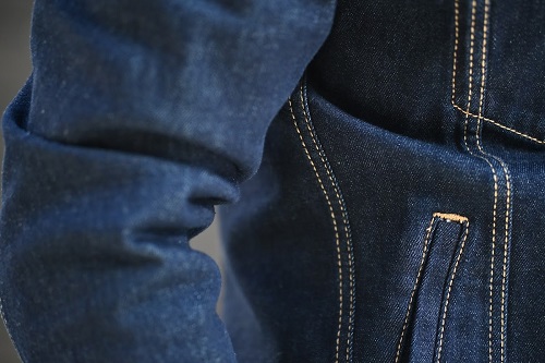 ポリエステルを混ぜる事によって丈夫さを加わった仕上がりになります。カラーは淡い色味よりもキレイ目スタイルに使いやすい濃いインディゴブルー。