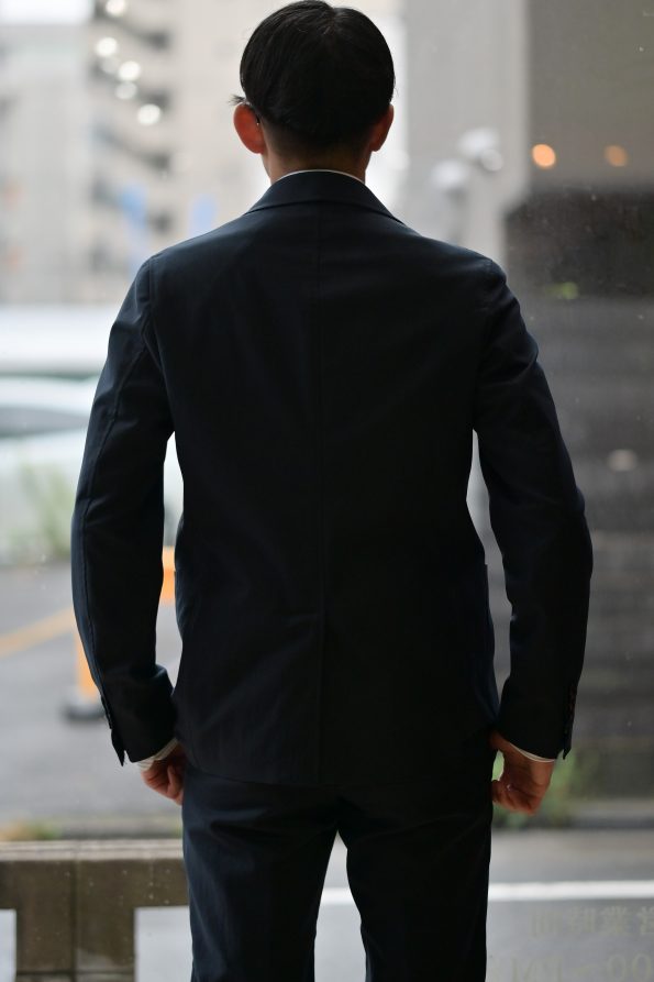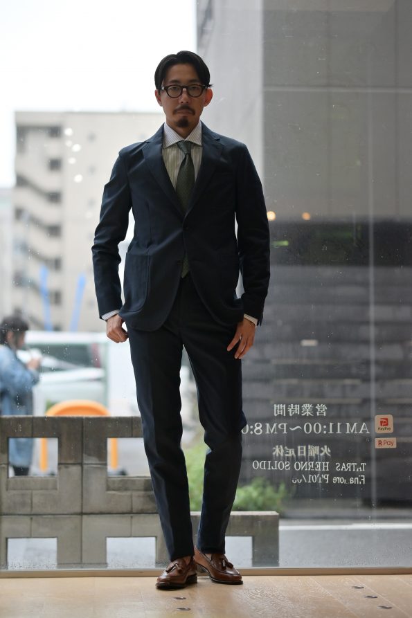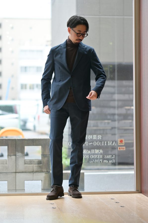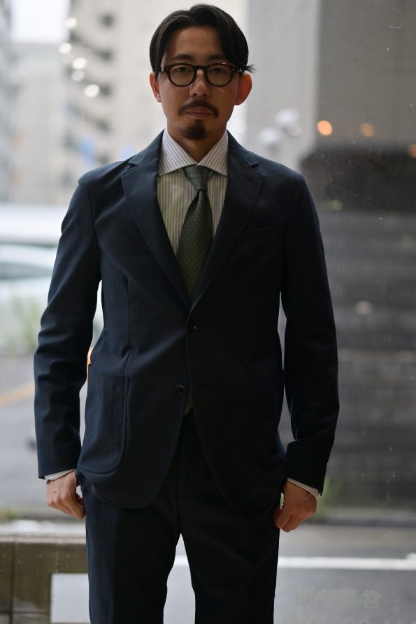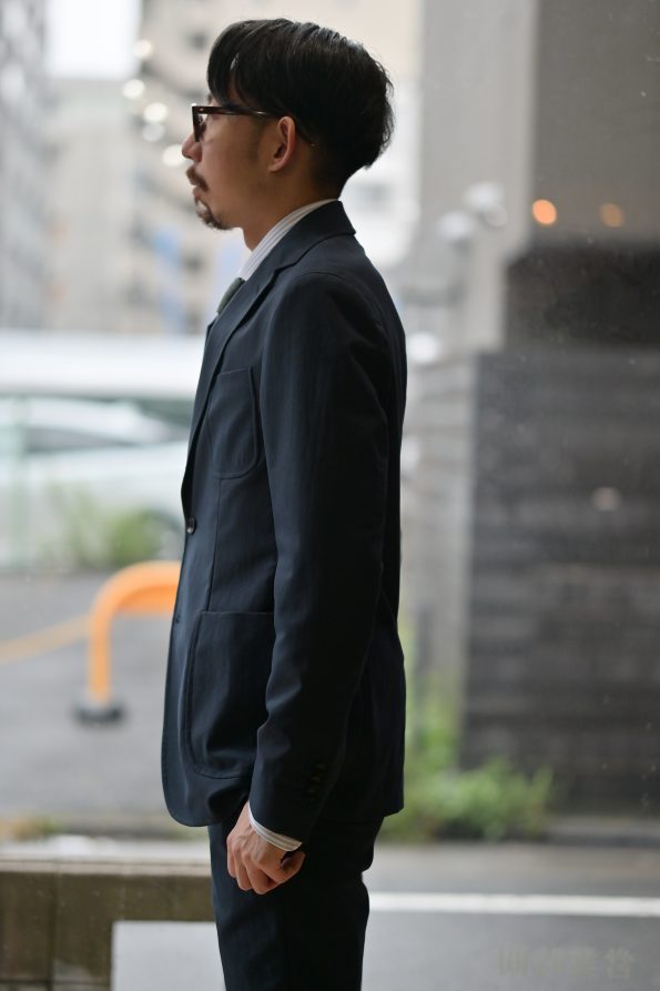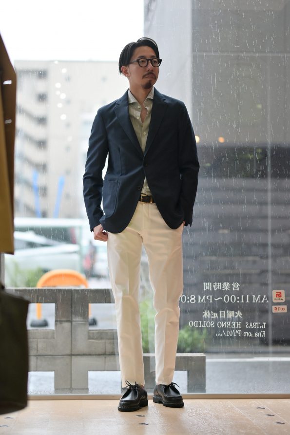 こちらはドレスシャツ合わせでタイドアップしてみました。カジュアルなディティールがありつつもシルエットは美ししいですので、ネクタイもバッチリきまります!勿論ノータイでもOK。この作りの美しさで洗えるなんて仕事使いを想定される方なら鬼に金棒ですよね。「カメラマンのスタッフもこれめちゃくちゃ良い感じじゃん」って言うくらい分かりやすくシルエットが綺麗なのでこれは是非セットでご試着頂きたい!^^