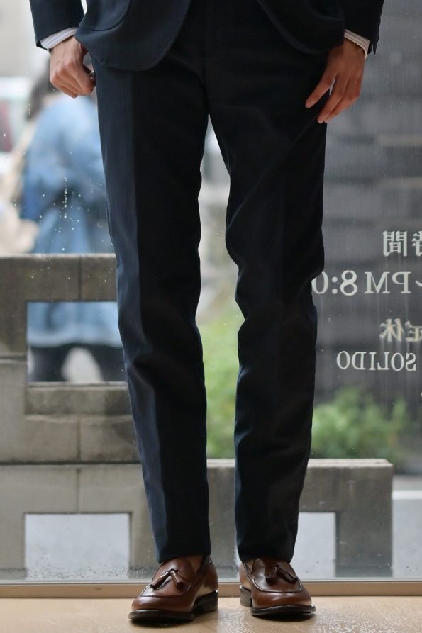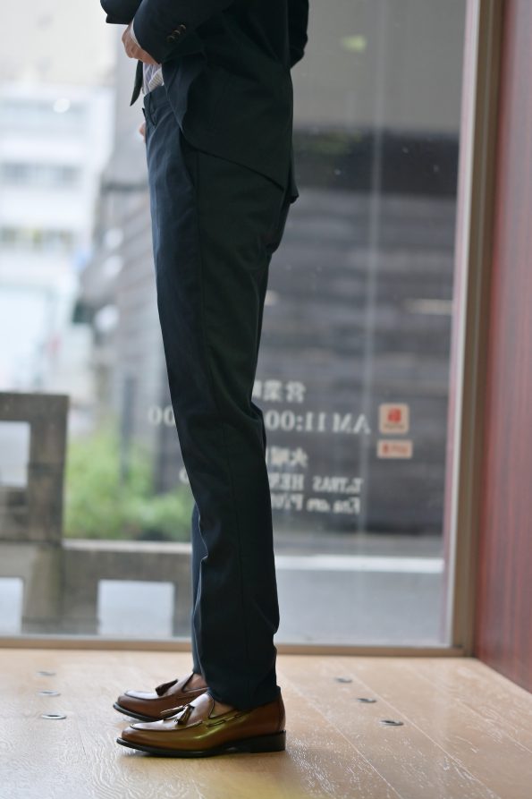 ウエスト80の僕はパンツも同じく46サイズを着用しています。特横からのラインで分かると思いますが細身で美しいシルエット!ジャケットと同じく軽素材なので履いていてストレスレスです。