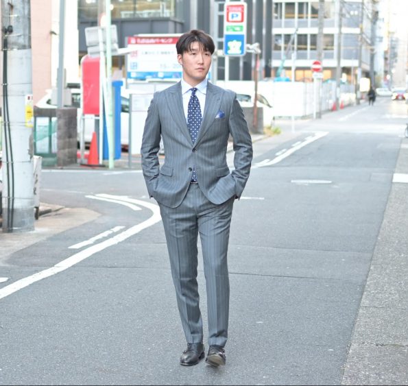 例えばこんな感じでグレーのストライプスーツに合わせてみたり。。。